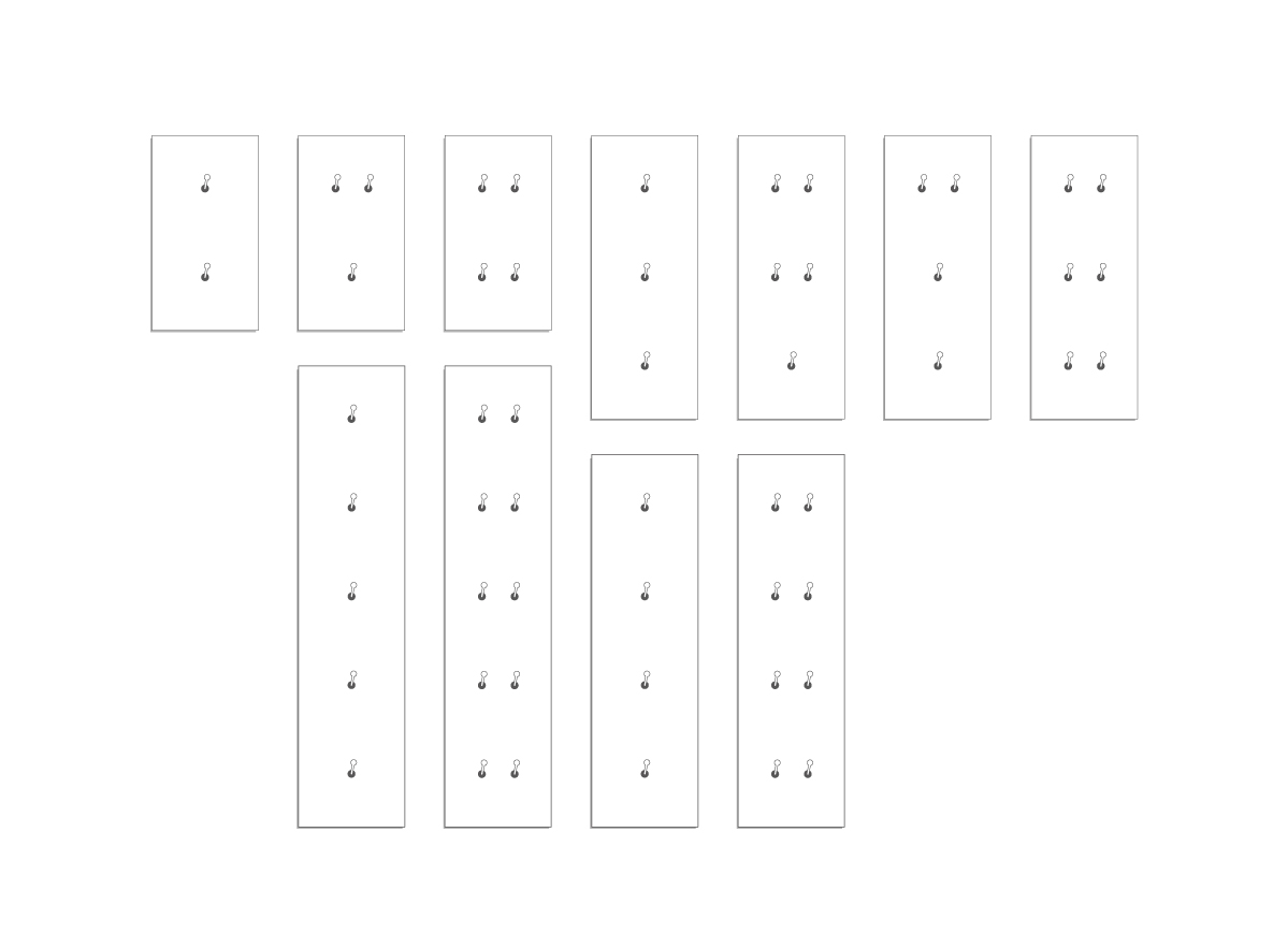 5 tailles de façades : simple 85 x 85 mm, double 85 x 156 mm, triple 85 x 227 mm, quadruple 85 x 298 mm, quintuple 85 x 369 mm. Utilisables verticalement ou horizontalement.