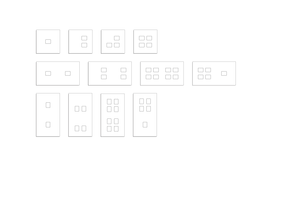 5 maten: single 85 x 85 mm, dubbel 85 x 156 mm, drievoudig 227 mm x 85, viervoudig 85 x 298 mm, vijfvoudig 85 x 369 mm. Verticaal of horizontaal gebruikt